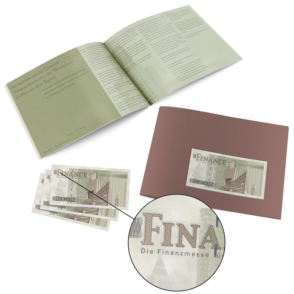 Broschüre zur Bewerbung einer Messe für Finanzprodukte. Das spannende daran: Die Gestaltung und Umsetzung eines „echten“ Geldscheins, inkl. Papierrecherche, Farbgebung, simuliertes Wasserzeichen und Silberfaden sowie Ornamentik und Gravurdruckamutung. Ein echtes Schmankerl, das man nur selten auf dem Tisch liegen hat.