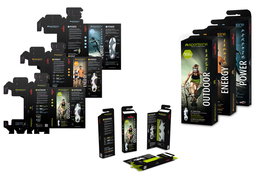Eine komplexe Verpackung für eine Sportsohle in drei Ausführungen ist zu gestalten, abzustimmen, reinzuzeichnen und für den Druck vorzubereiten. Eine Präzisionsarbeit, die ein extremes Maß an Genauigkeit und eine enge Zusammenarbeit mit der Produktion erfordert.